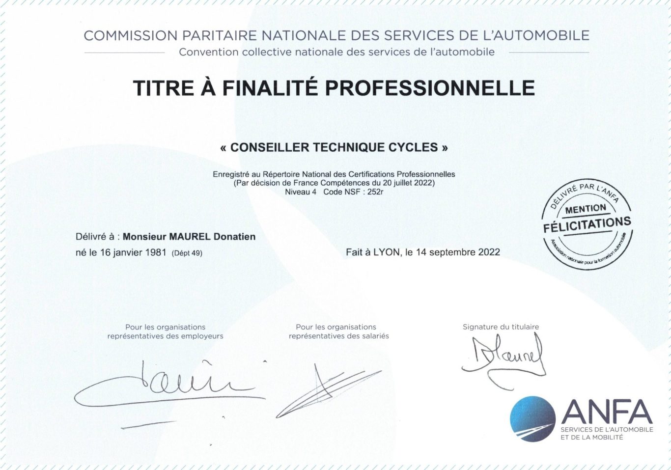 Diplomé de l'INCM (Lyon) en qualité de Conseiller Technique Cycles, veille technologique, maintien des compétences sur les motorisations, outillage moderne, pour un résultat optimum.